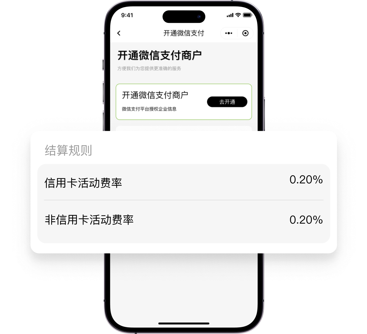 平台直连微信支付,提供 0.2% 的行业最低费率。相比常见的 0.35% ~ 0.6%,每一笔交易都能为商户节省成本,交易越多,节省越多,适合高频收款场景。
